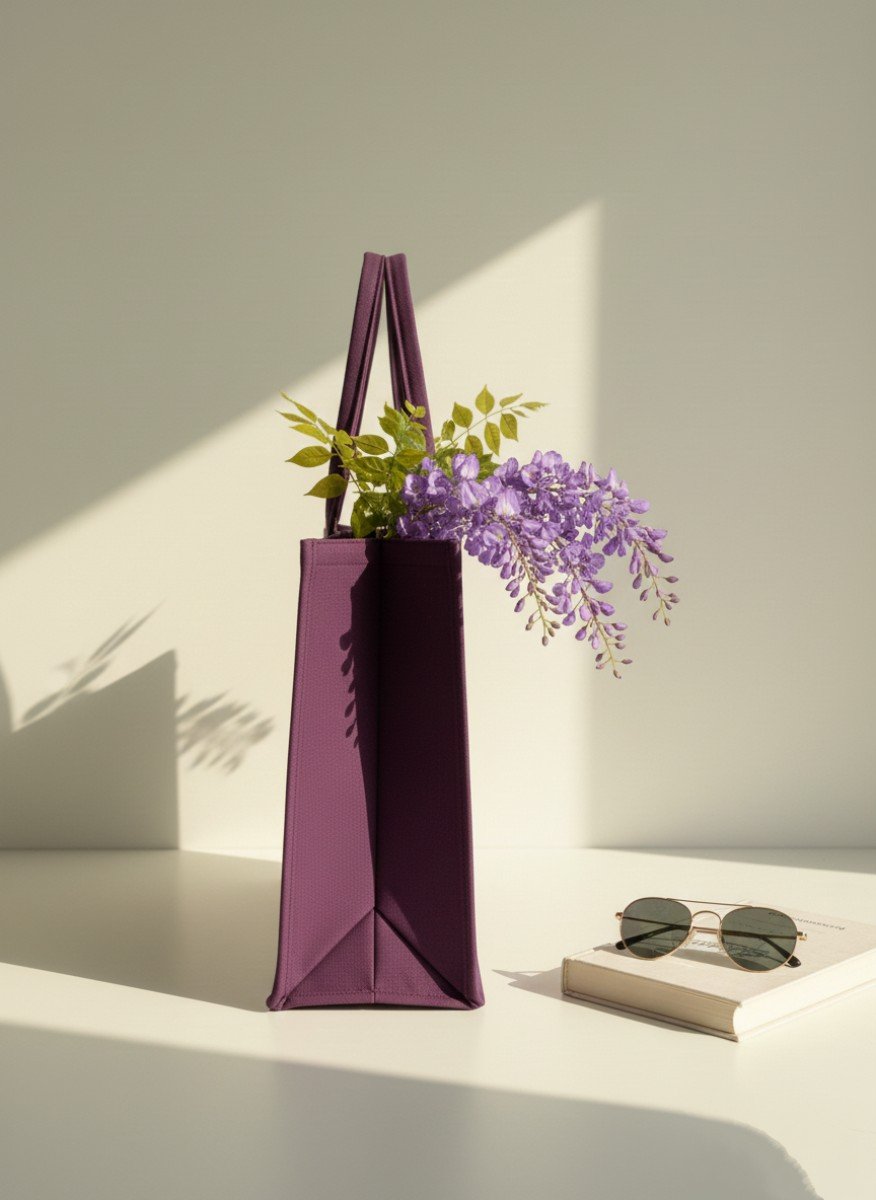 This tote bag is adorned with flowers embroidered with purple thread motifs. It’s a perfect blend of traditional Indian artistry and modern functionality, making it an ideal accessory for both daily errands and festive outings.