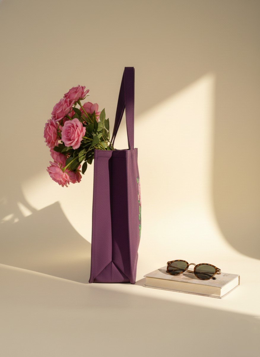 This tote bag is adorned with thread embroidered Pink rose flower motif. It’s a perfect modern functionality, making it an ideal accessory for both daily errands and festive outings.